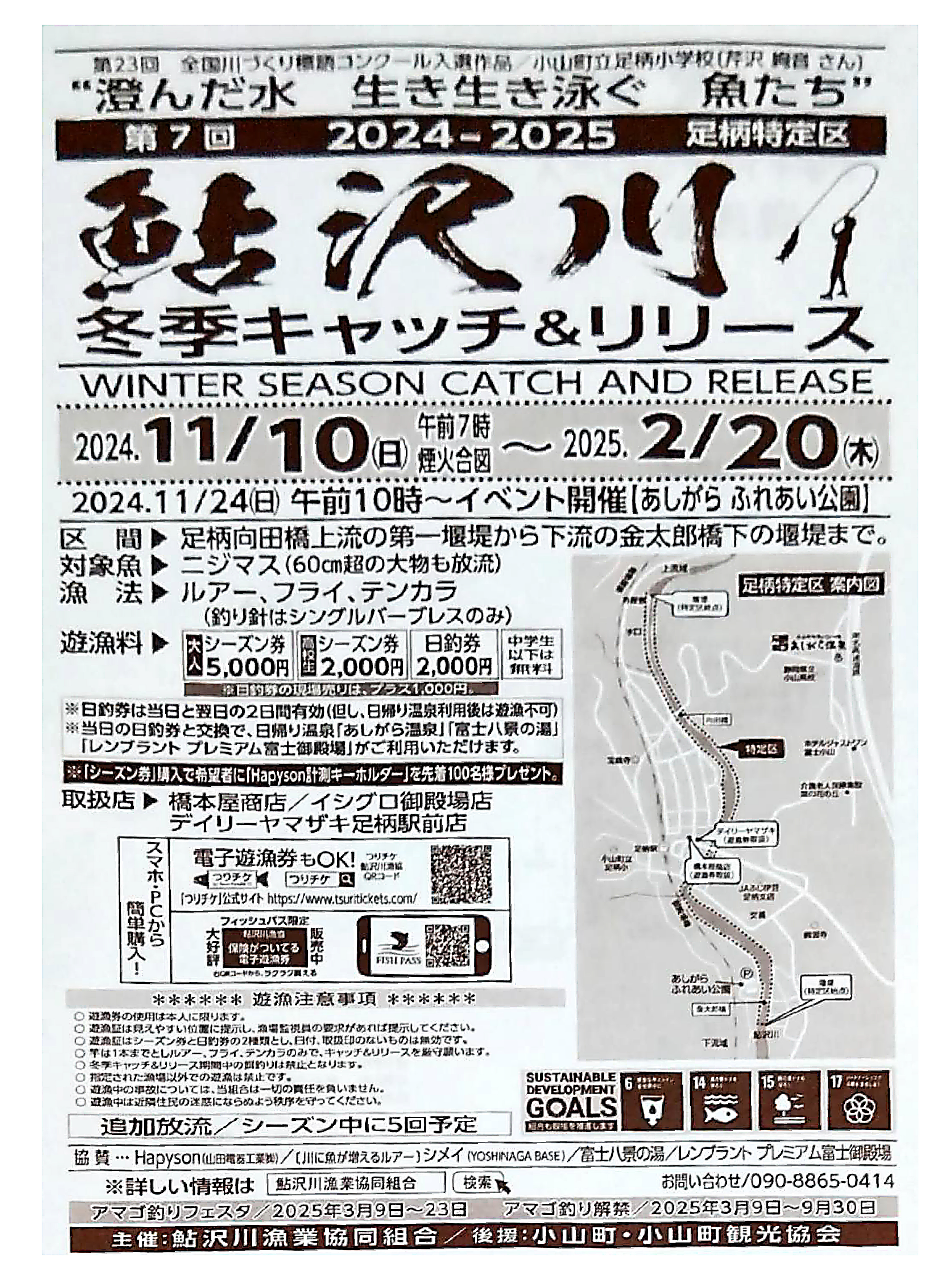 2024年11月24日に、足柄ふれあい公園で開催される「足柄ふれあいおさかなマルシェ」内にて、鮎沢川釣り愛好会(AFFC)による冬季C&Rイベントが開催されます。